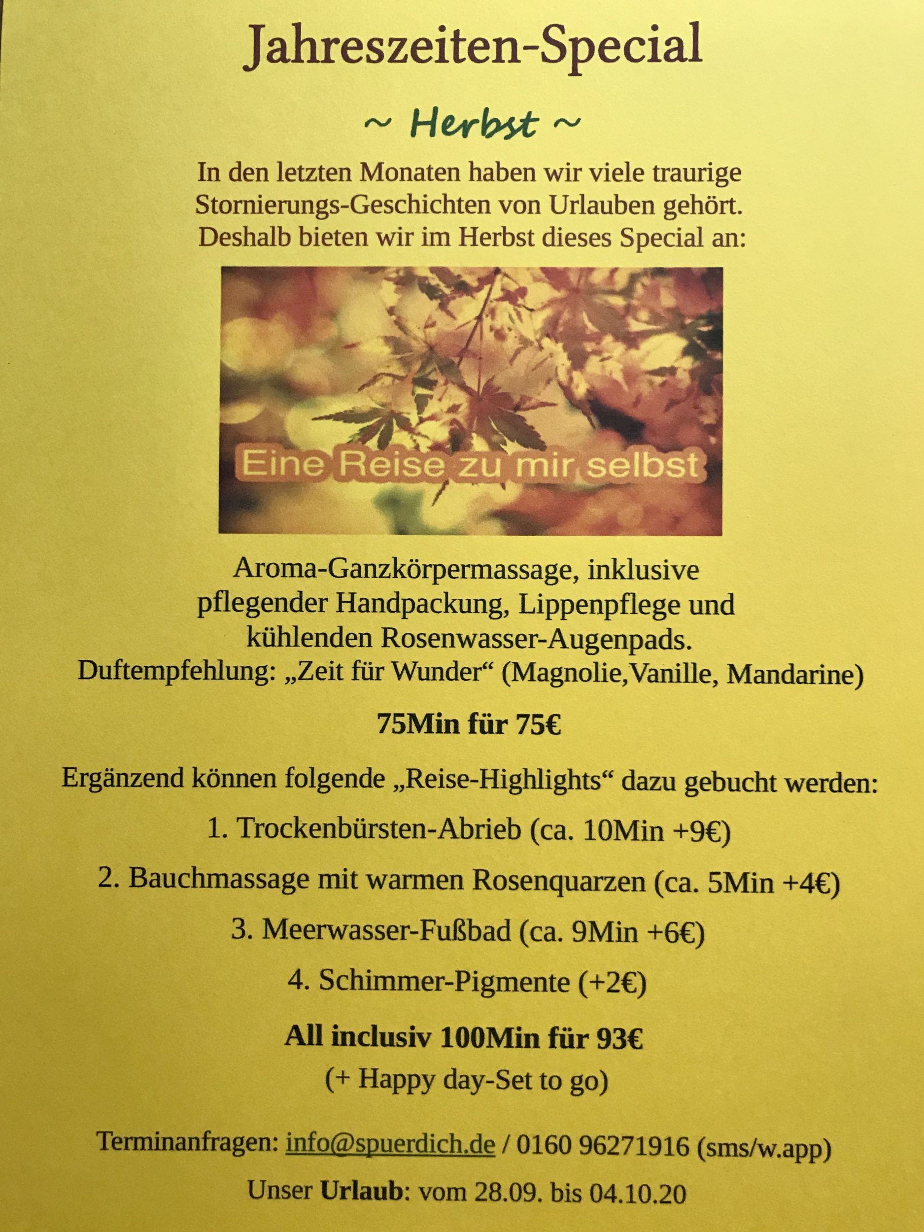 Jahreszeiten-Special Nicole Huth2020-09-20T10:47:45+02:0020 September 2020| Share This Story, Choose Your Platform! FacebookXRedditLinkedInPinterest Ähnliche Beiträge Termine bis zum Jahresanfang 2026 Gallerie Termine bis zum Jahresanfang 2026 Primavera Aroma-Massage Kurs Primavera Aroma-Massage Kurs Urlaub Urlaub 5er und 10er Karten 5er und 10er Karten Jahresurlaub 2025 Jahresurlaub 2025 Hinterlasse einen Kommentar Antwort abbrechenKommentar